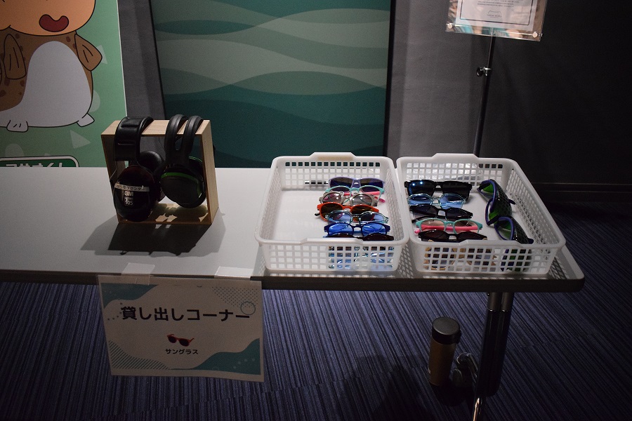 イヤーマフやサングラスの貸し出し、支援グッズの展示を行いました。
