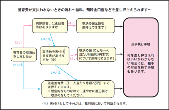 取り決めた養育費や法定養育費が支払われない場合、相手の財産の差押手続を申し立てることができます(地方裁判所に申し立てます)。