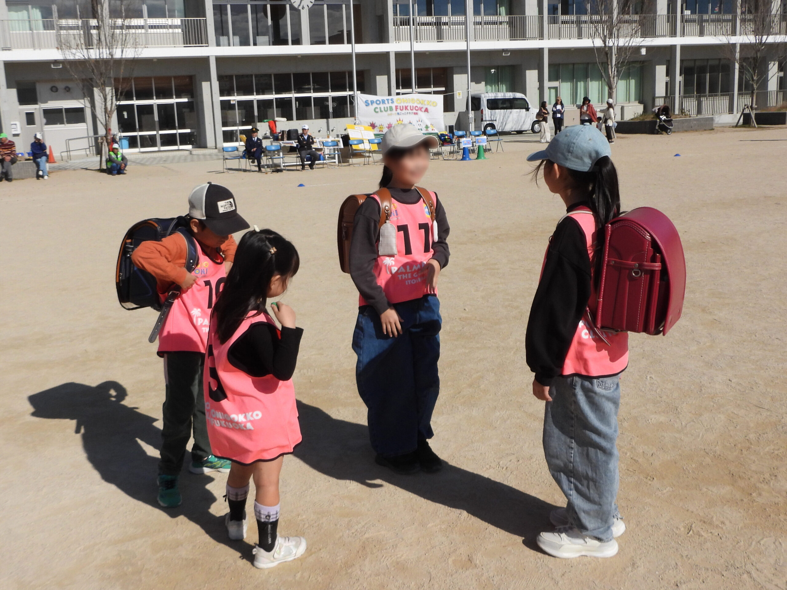 小学校の校庭に、通学路に見立てた道とセーフティーエリアをつくります。参加者は小学生、子どもを追いかける鬼役(不審者役)、通学路を歩きながら見守る安全係、助けを求める窓口となる「こども100当番」です。集団下校を想定して、ランドセルを背負います。