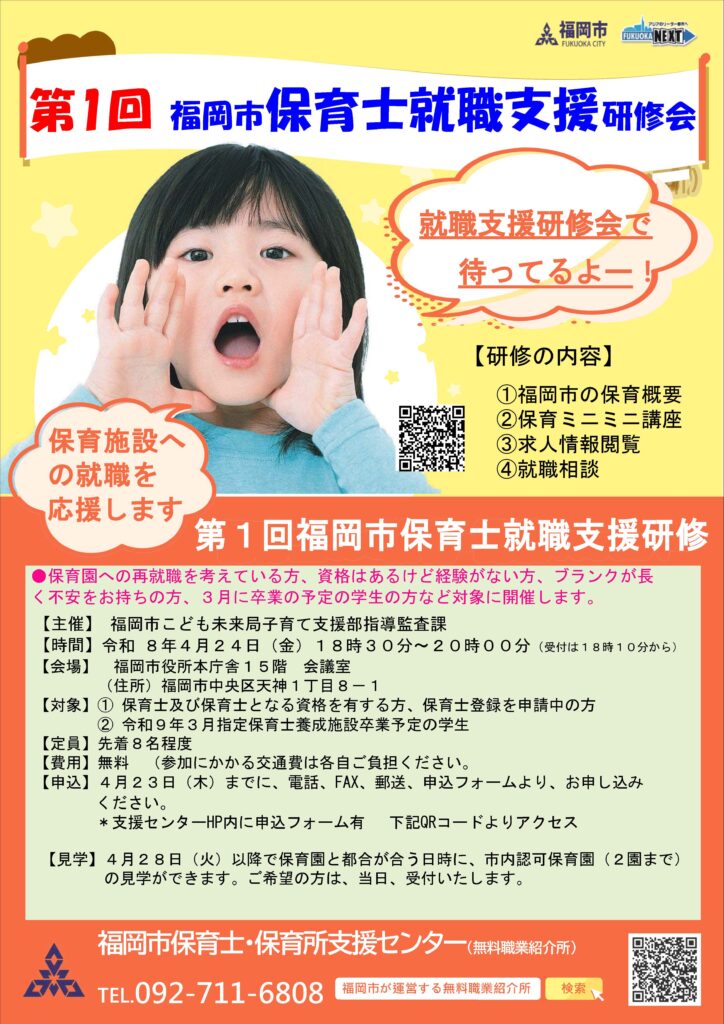 ◎令和8年度 第1回福岡市保育士就職支援研修は、4月24日(金)18時30分から福岡市役所にて開催されます。