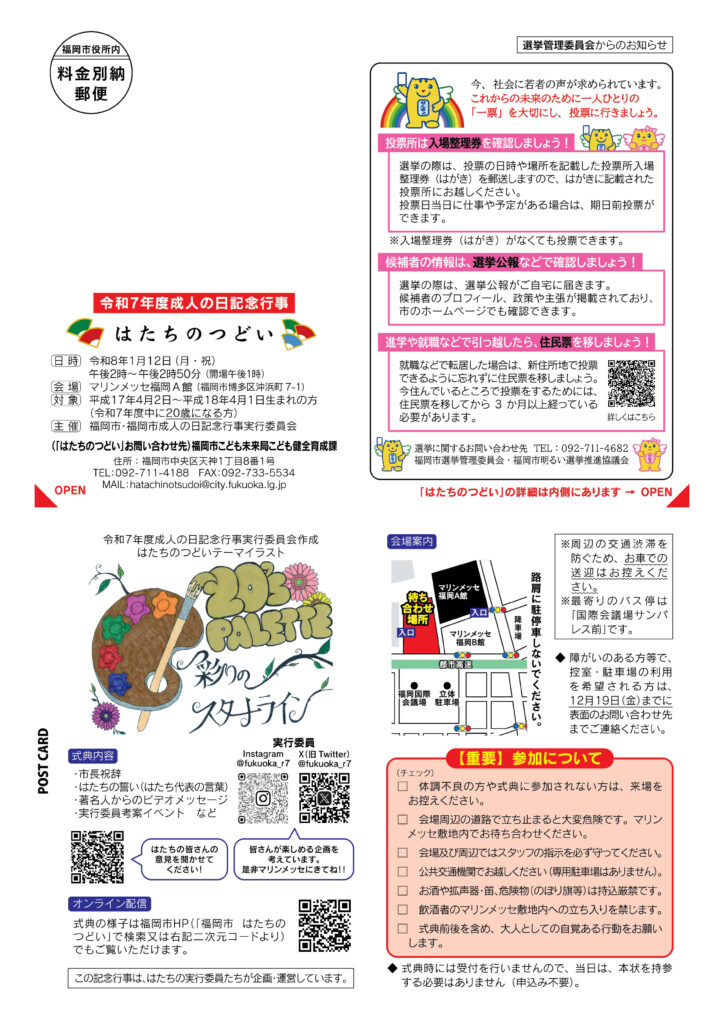 案内はがきを、10月末時点で福岡市内に住民票がある、令和7年度に20歳となる方を対象に、12月3日に発送しています。(送付先:住民票の所在地)